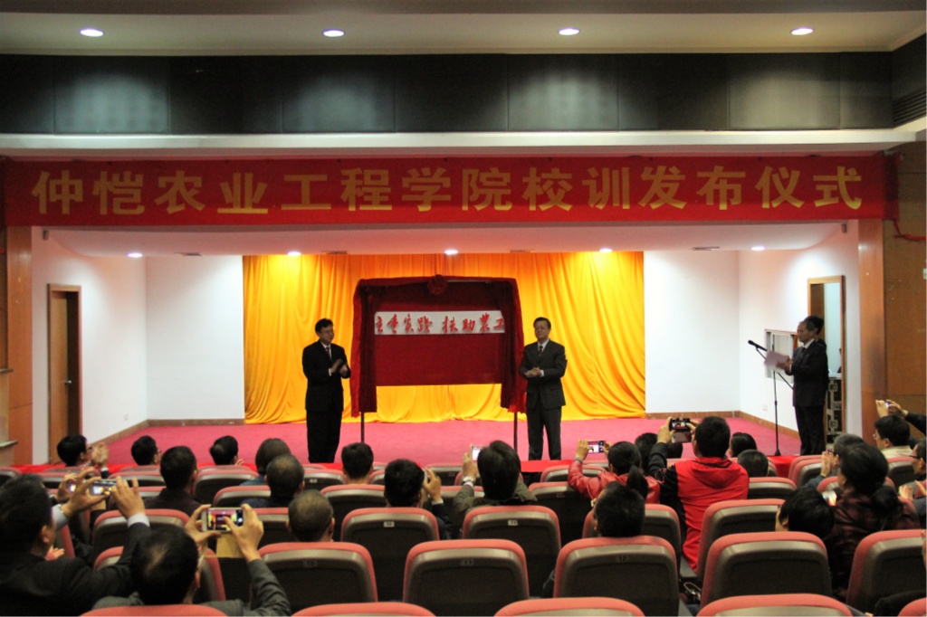发布仪式有两项议程。第一项议程是党委书记宋垚臻与校长骆少明揭幕校训。学校自2014年9月启动校训征集工作以来,经过组织专家认真评选、提炼,召开专题会议研究讨论及广泛征求师生员工和教代会代表意见,并通过对遴选出的方案进行反复修改完善,经学校党委常委会集体讨论和研究,最终确定“注重实践、扶助农工”为学校校训。