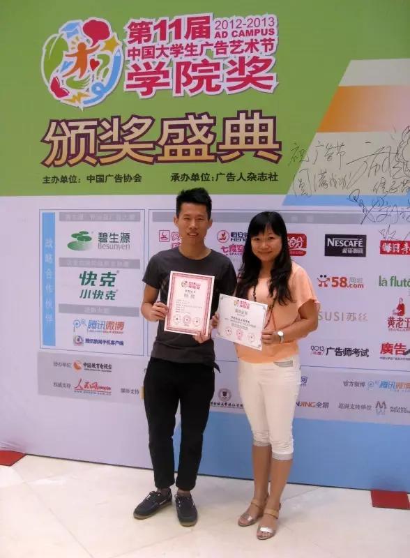 2013指导学生参加中国大学生广告艺术节学院奖竞赛,共有49名学生获奖,其中1名学生获得全国银奖,2名学生获得全国铜奖。