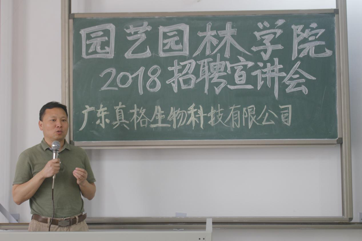 4月12日下午,园艺园林学院2018招聘宣讲会在白云校区D栋510室举行,此次宣讲会由广东真格生物科技有限公司招聘负责人钱洋华先生主讲,出席会议的嘉宾有广东真格生物科技有限公司的副总经理陈晓辉先生,园艺园林学院大三、大四学生参加本次宣讲会。