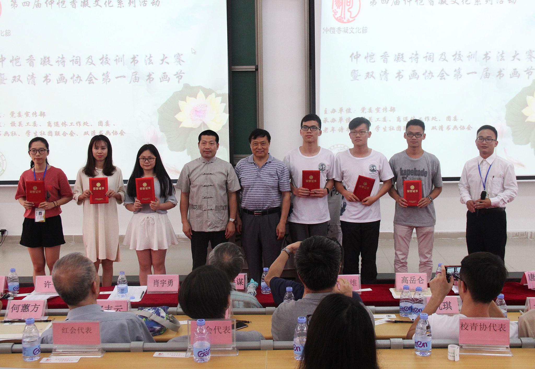 按照第四届仲恺香凝文化节活动(4月23日—6月27日)的安排,5月13日,由党委宣传部主办,校关心下一代工作委员会、离退休工作处、团委、老年诗书画社、学生社团联合会及双清书画协会承办的第四届仲恺香凝文化节之仲恺香凝诗词及校训书法赛暨双清书画协会第一届书画大赛于白云校区D2报告厅举办。校关工委常务副主任高岳仑,党委宣传部部长唐明勇,广州市青年书法家协会副主席、秘书长肖宇勇,离退休工作处副处长赖伟梁,何香凝艺术设计学院副教授许平,老年诗书画社社长方焕谋及团委、人文与社会科学学院代表等出席本次大赛。学校学生社团及兄弟院校代表等也到场参加。