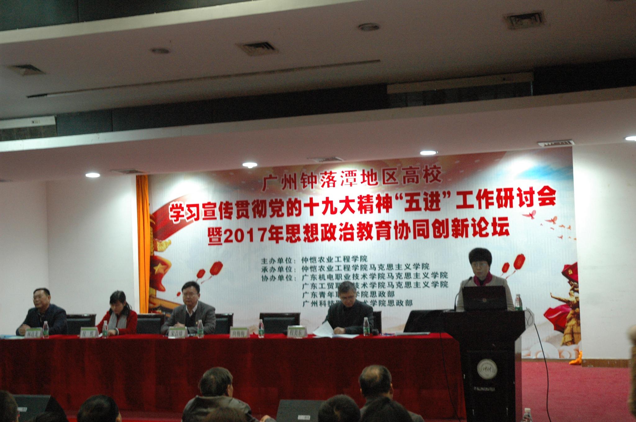 12月17日上午,由我校主办,我校马克思主义学院承办,广东机电职业技术学院马克思主义学院、广东工贸职业技术学院马克思主义学院、广东青年职业学院思政部、广州科技职业技术学院思政部协办的“广州钟落潭地区高校学习贯彻党的十九大精神‘五进’工作研讨会暨2017年思想政治教育协同创新论坛”在我校海珠校区学术报告厅举行。校党委书记宋垚臻,广东省教育厅思政处副处长倪熙,北京大学马克思主义学院程美东,广州科技职业技术学院党委副书记林达龙出席开幕式。开幕式由我校党委副书记、纪委书记向梅梅主持。