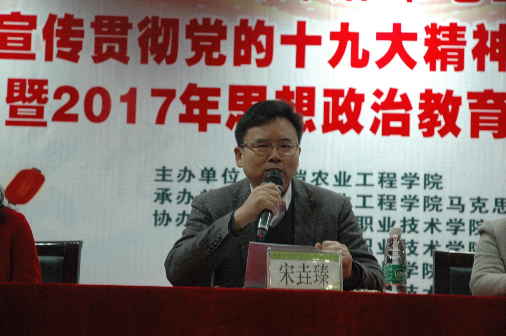 宋垚臻在开幕式上致辞,他对参加本次会议的各位领导、专家、思政课教师表示衷心感谢和热烈欢迎。他指出,党的十九大为我国高等教育指明了发展的方向。学习宣传贯彻党的十九大精神,是高校全体思想政治工作队伍长期的任务和义不容辞的光荣职责。他认为,五所高校聚集在一起,共同研讨新时代“党的十九大精神‘五进’(进教材、进课堂、进网络、进学生社区、进学生头脑)工作”的方式方法,研讨五所高校思想政治教育协同的新方法新举措,一是体现了五校思想政治工作者极高的政治自觉,二是体现了五校思想政治工作者开展理论研究的高度自觉性,三是为五校思想政治工作者提供了一个协同创新共同发展的平台。同时,他提出了三点建议,一是希望加强对习近平新时代中国特色社会主义思想的研究力度,多出一批有影响力,有广泛传播效应的理论成果。二是希望此次会议召开后,“广州钟落潭地区高校思想政治教育协同创新论坛”能常态化、制度化。三是希望围绕此次会议和论坛的召开,打造一个体现五所院校共同特点的思想政治教育品牌。最后,他希望大家能够以十九大的召开为契机,将十九大精神内化于心,外化于行,充分展示钟落潭地区高校教师的独特风采,推动该地区五所高校思想政治工作再上一个新台阶。