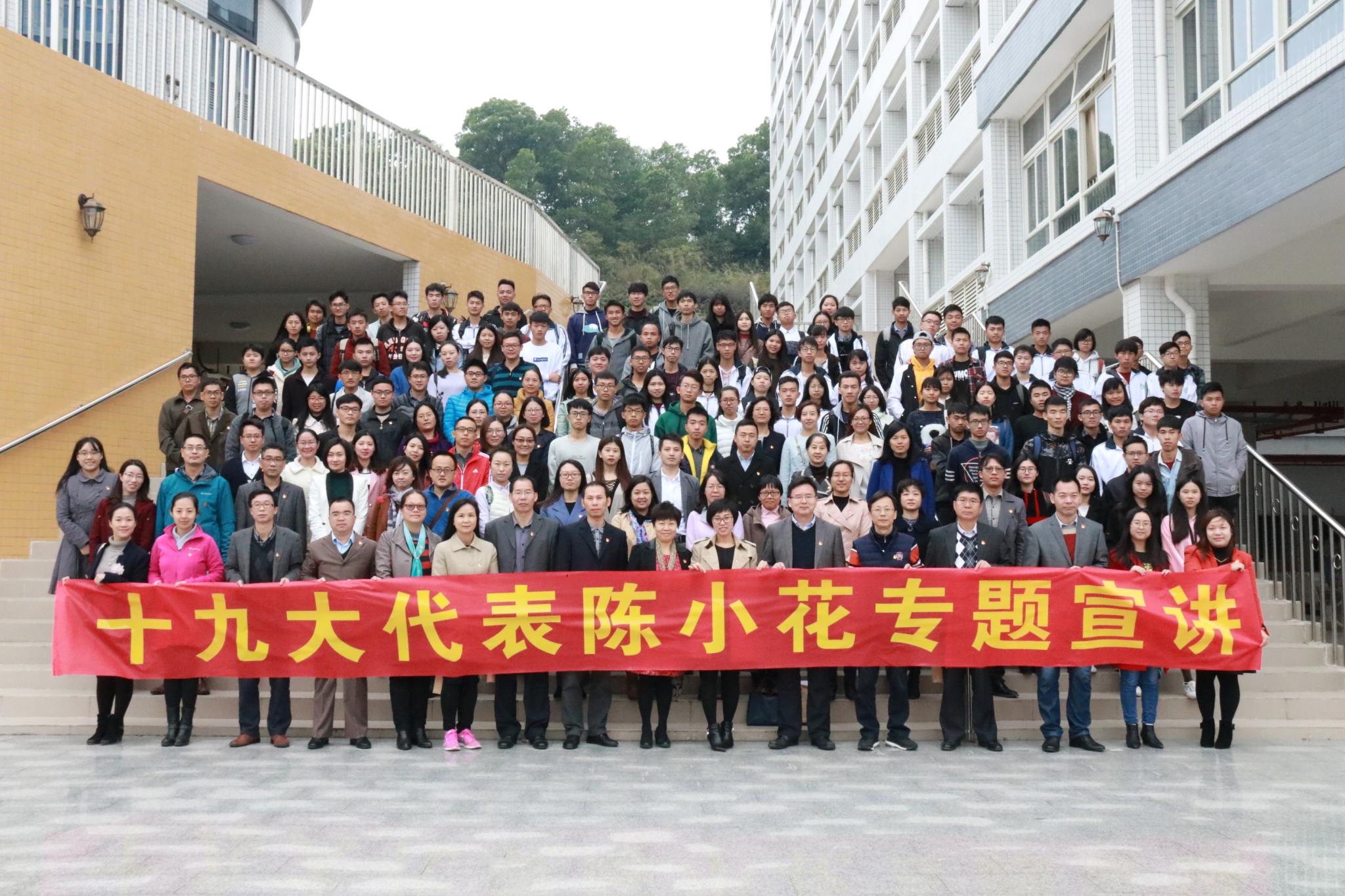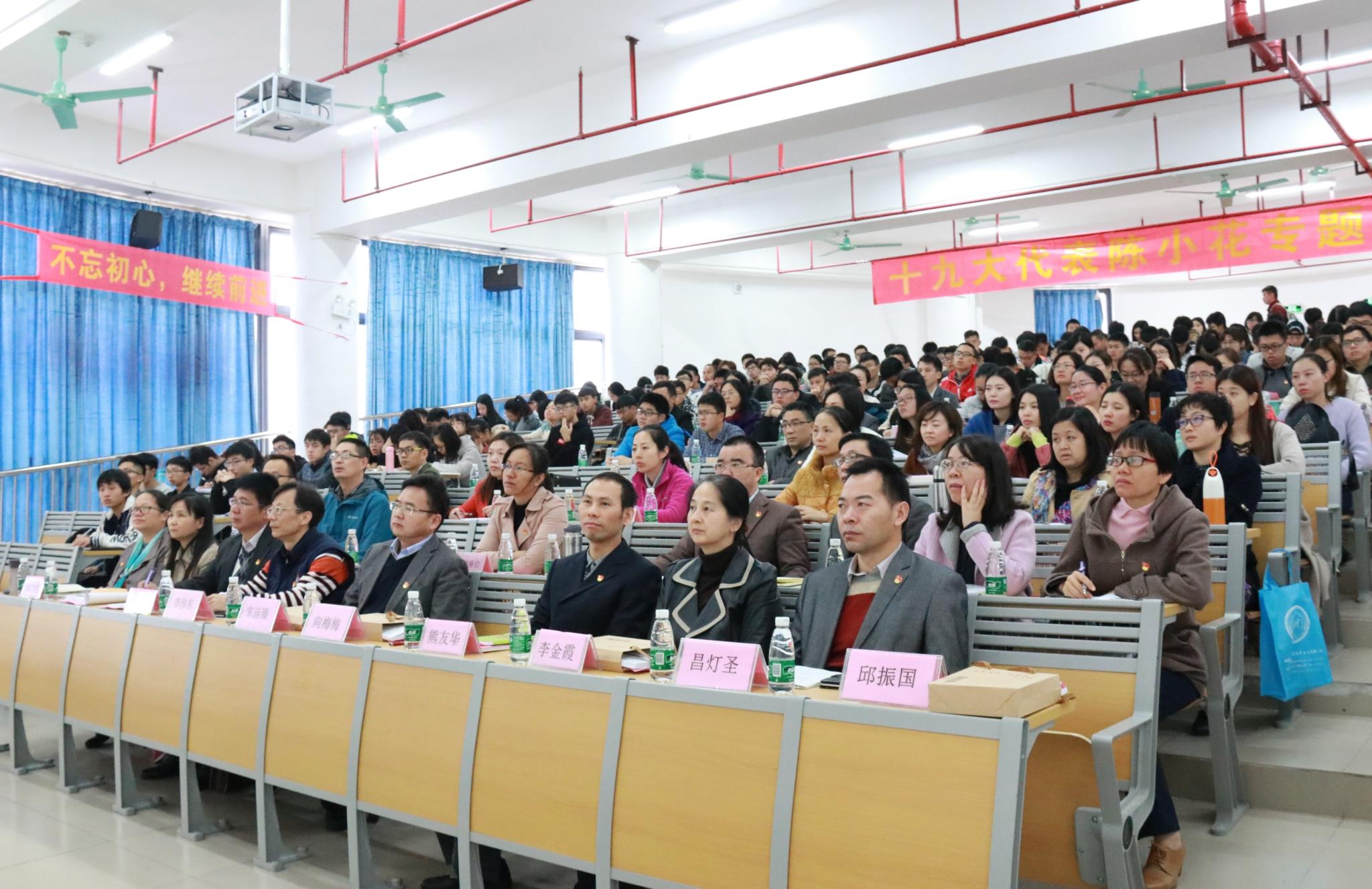 为深入学习贯彻宣传党的十九大精神,12月14日上午,学校邀请党的十九大代表、全国辅导员年度人物、广东省“劳动模范”、省“三八红旗手”、广东技术师范学院辅导员陈小花莅临白云校区D201作“不忘初心跟党走,立德树人有作为——十九大报告精神传达”专题讲座。学校党委书记宋垚臻、党委副书记向梅梅出席会议,全体学生工作干部、学生党员和学生入党积极分子参加会议。