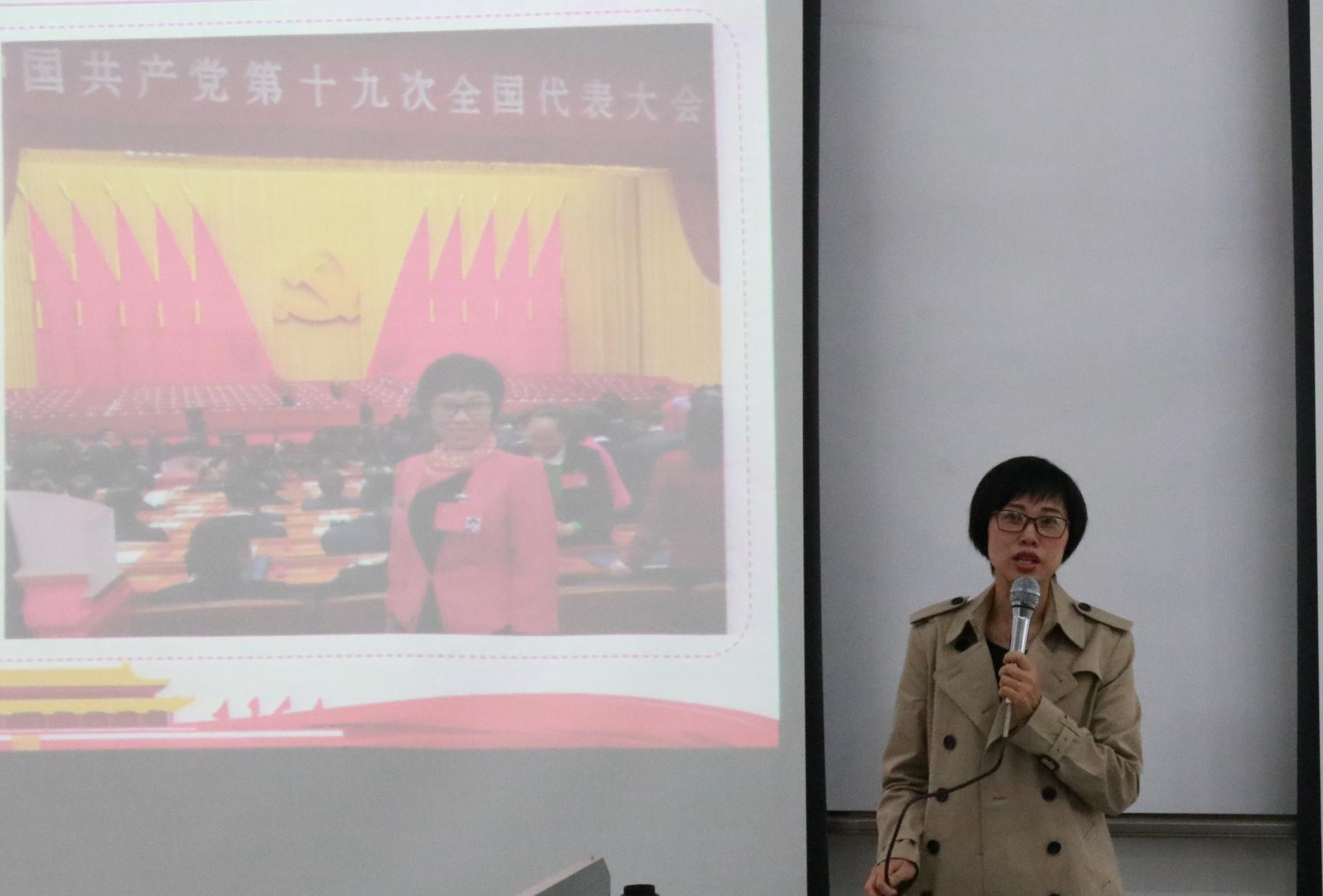报告中,陈小花回顾了自己作为党代表参加十九大的所见所闻,分享了自身感悟,带领大家重温了会议内容,并结合辅导员工作从“新、心、信、行”四个关键词对十九大精神重新进行解读。“新”是指新时代、新征程、新思想、新要求、新飞跃。中国从站起来到富起来,现在正在向强起来迈进,展示给世界一个全新的面貌;“心”是指以人民为中心,党始终坚持全心全意为人民服务的宗旨;“信”是指信心,我们国家有实现中华民族伟大复兴的信心和能力;“行”是指行动力,十八大以来,党破解了许多过去想解决而没有解决的问题,办成了许多过去想办成而没有办成的大事。“我们要结合自己的工作和所学专业,对标十九大报告,做出自己应有的贡献。”陈小花激励在座的师生。