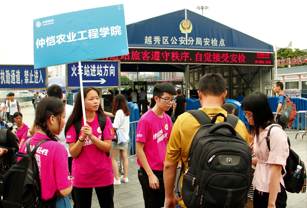 我校学生团务中心和学生社团联合会的志愿者们分别在省客运站、广州市站、天河客运站有序地开展2017级仲恺迎新活动。据悉,早上6:30,海珠和白云两个校区共有56名志愿者参加本次省站与广州站的迎新活动,中午再度派出了第二批志愿者。由于各大高校开学报到的时间集中在一起,再加上站点客流量较大,大大增加了本次迎新工作的难度。仲恺站点的志愿者手举“仲恺农业工程学院”的标牌,在人群中尤为显眼。一位迎新志愿者说:“我们很期待这次迎新活动,虽然过程很辛苦,但当看见新生与家长轻松的脸庞和露出的微笑,会感到这一切都是值得的。”