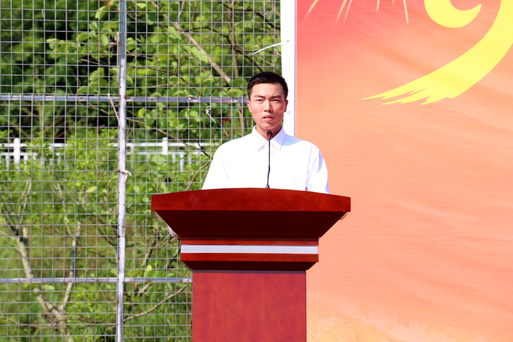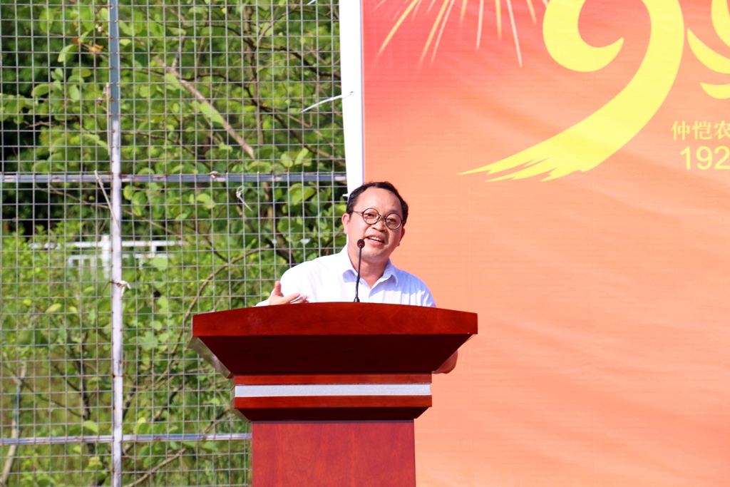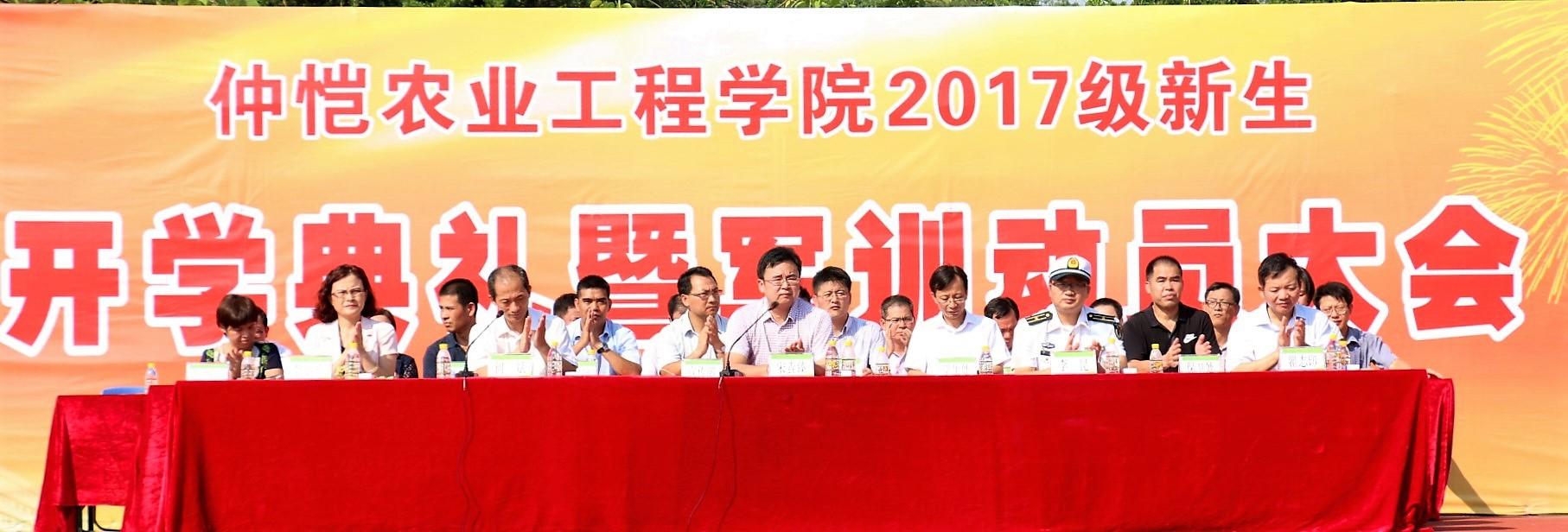在慷慨激昂的国歌声中,大会拉开序幕。宋垚臻讲话。他首先向全体新生成为仲恺大家庭的一员、在这里开启自己的青春历程表示热烈的祝贺。接下来,他回顾了学校90载艰苦办学的光辉历程,指出了学校独特的地位。他说:“仲恺是有着光荣历史的大学,今天你们怀抱理想、肩负使命来仲园求学,四年后,你们将奔赴各地,去实现抱负,追求美好的生活,成为实现伟大中国梦的主力军的一员。”接着他对新生们提出“十二个字”的建议:一是立大志。青年人要志存高远,正值青春年华之际,要将自己的远大抱负和国家命运紧紧结合在一起,成为一个有理想、有远大抱负的人;二是勇探索。大学是追求真理、探索未知、创造知识的地方。新生要对未来怀着强烈的好奇心。专业本无好坏之分,每个专业领域都有值得探索的地方;三是强体魄。我们肩负实现中华民族伟大复兴的责任,需要强壮体魄来提供保障;四是懂合作。新生们要学会与人合作,尊重他人,在团队中学会服从安排,将大家的力量凝聚起来。最后他希望学生教官对学生真正做到高标准、严要求;希望新生服从教官,一切听从指挥,敢于挑战极限,以优异的成绩完成军训,向学校交一份满意的答卷。